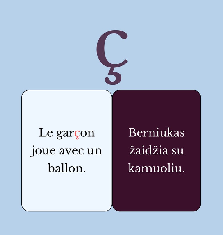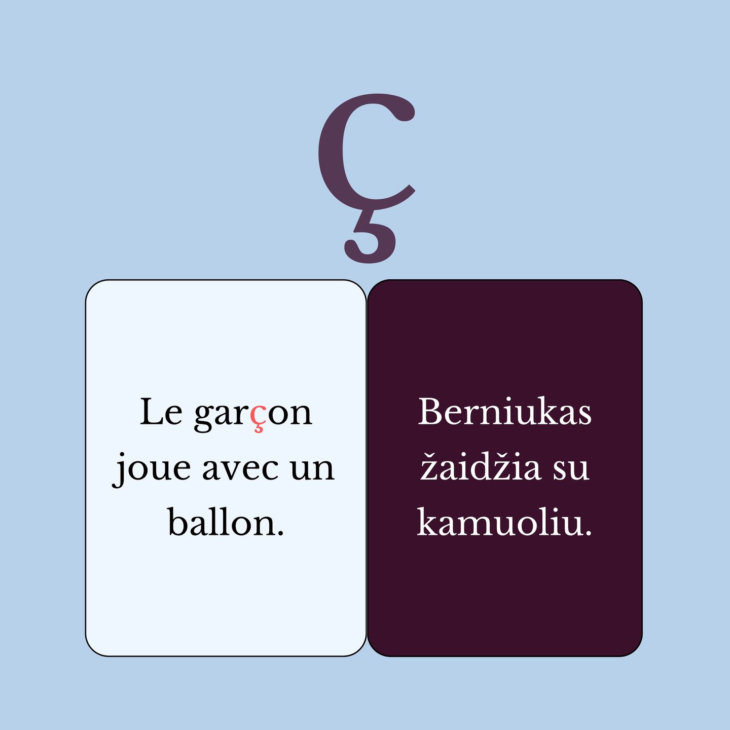 Prancūzų kalboje paprasta c prieš balses a, o, u tariama /k/, o ši įdomi raidė vartojama, kai reikalingas /s/ garsas.